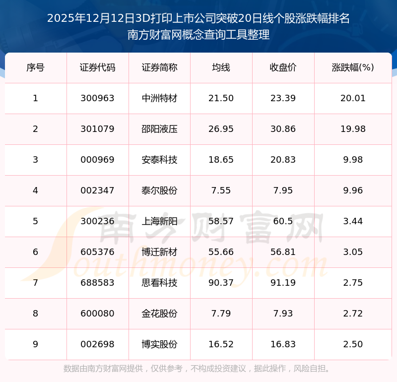 根据南方财富网概念查询工具数据统计,截止2025年12月12日收盘,3D打印上市公司共有9只个股收盘价向上突破了20日线。其中涨幅较大的个股有中洲特材、邵阳液压、安泰科技等,涨幅分别为20.01%、19.98%、9.98%。