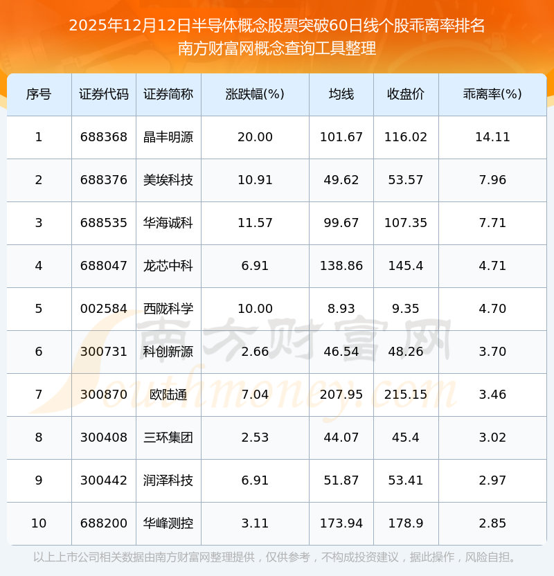 根据南方财富网概念查询工具数据统计,截止2025年12月12日收盘,半导体概念股票共有21只个股收盘价向上突破了60日线。其中乖离率较大的个股有晶丰明源、美埃科技、华海诚科等,乖离率分别为14.11%、7.96%、7.71%。