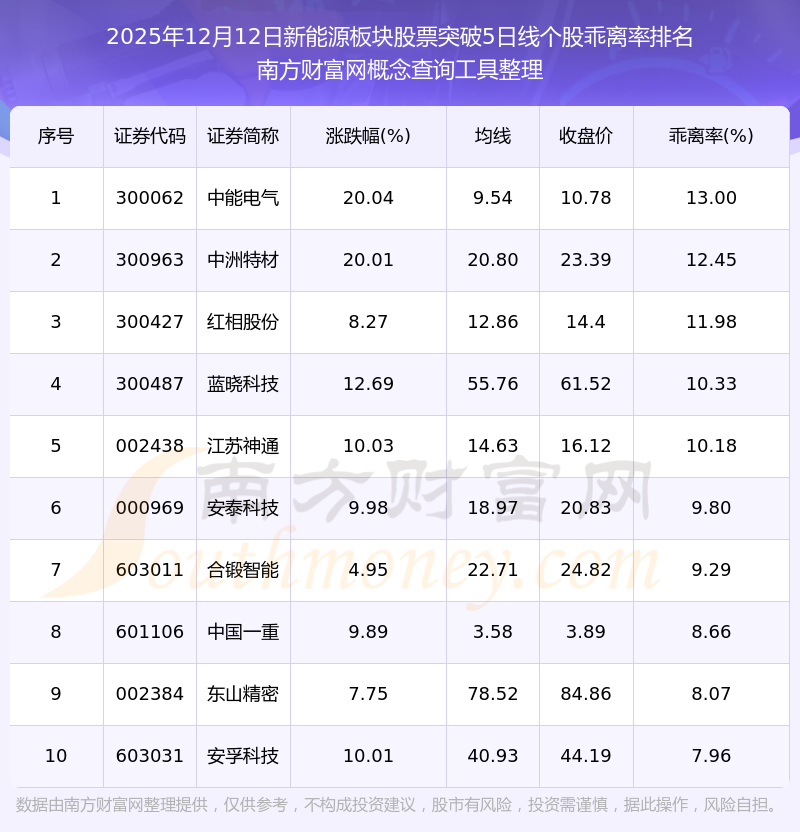 2025年12月12日新能源板块股票突破5日线个股乖离率排名