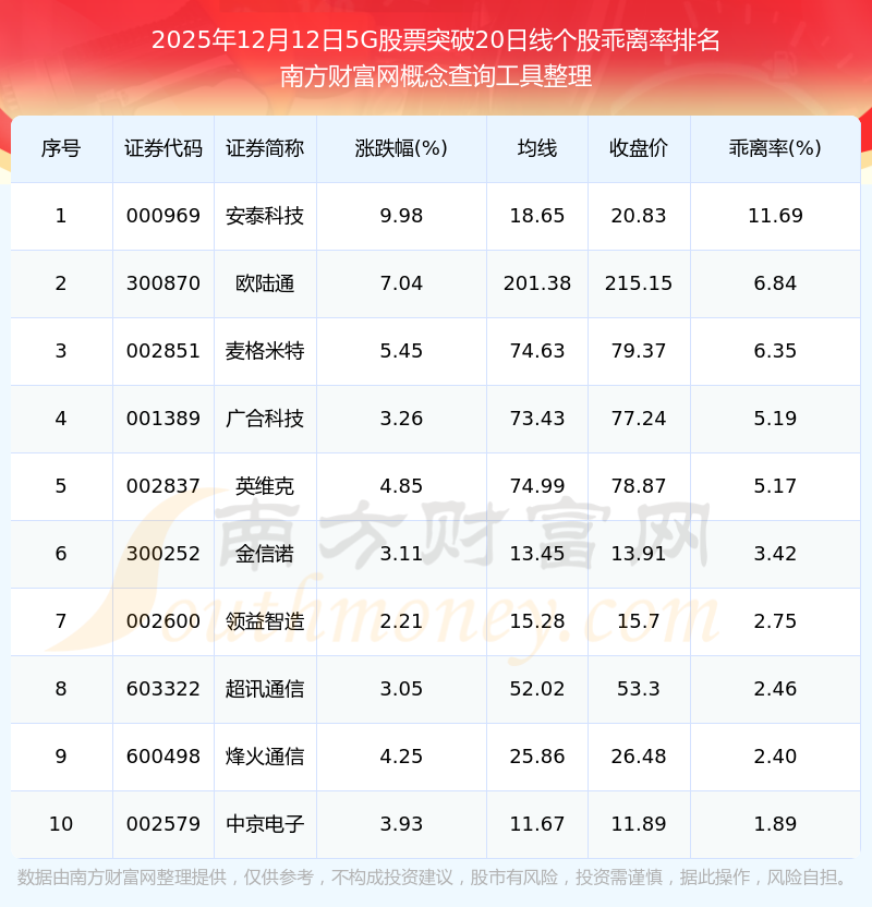 根据南方财富网概念查询工具数据统计,截止2025年12月12日收盘,5G股票共有19只个股收盘价向上突破了20日线。其中乖离率较大的个股有安泰科技、欧陆通、麦格米特等,乖离率分别为11.69%、6.84%、6.35%。