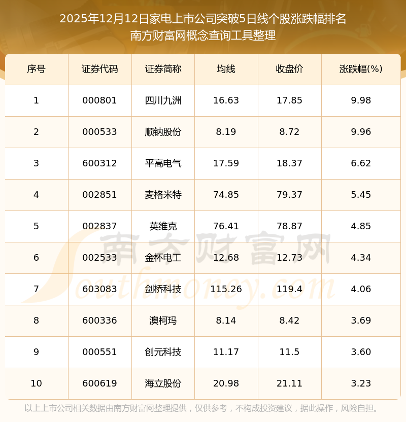 2025年12月12日家电上市公司突破5日线个股涨跌幅排名