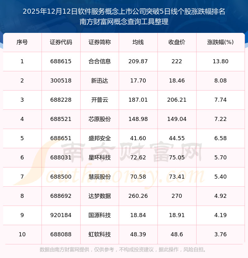 根据南方财富网概念查询工具数据统计,截止2025年12月12日收盘,软件服务概念上市公司共有16只个股收盘价向上突破了5日线。其中涨幅较大的个股有合合信息、新迅达、开普云等,涨幅分别为13.80%、8.08%、7.74%。
