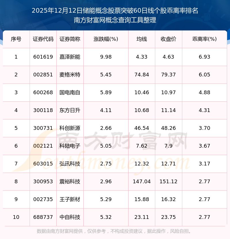根据南方财富网概念查询工具数据统计,截止2025年12月12日收盘,储能概念股票共有23只个股收盘价向上突破了60日线。其中乖离率较大的个股有嘉泽新能、麦格米特、国电南自等,乖离率分别为6.93%、6.05%、4.88%。