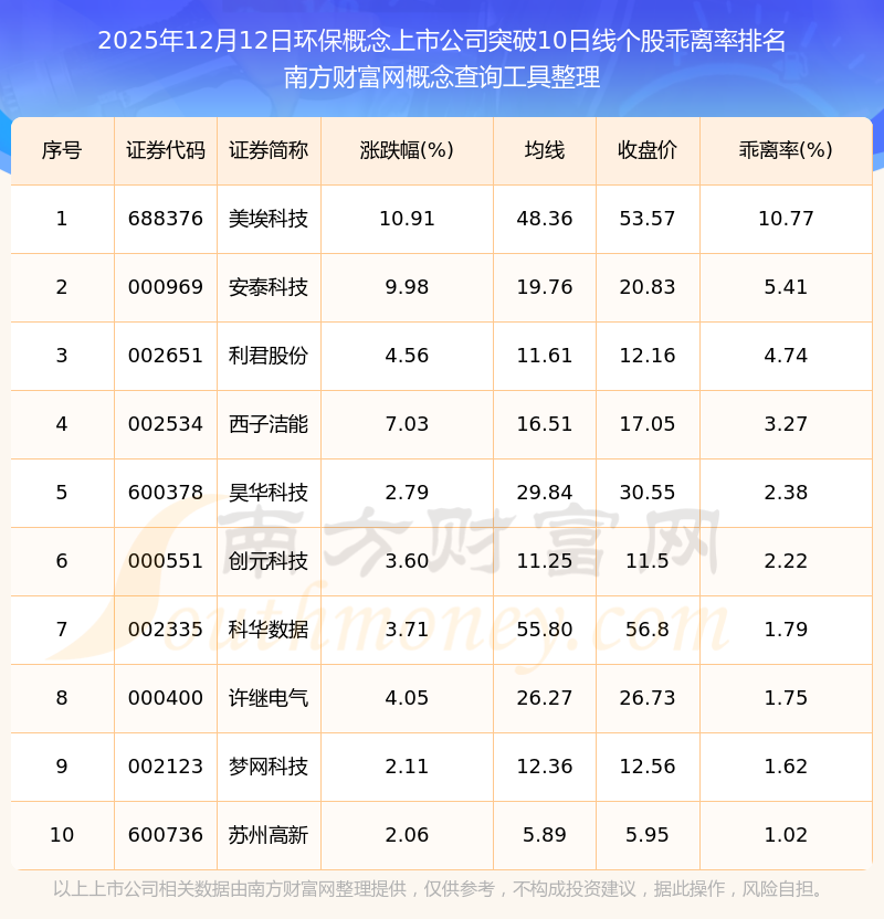2025年12月12日环保概念上市公司突破10日线个股乖离率排名