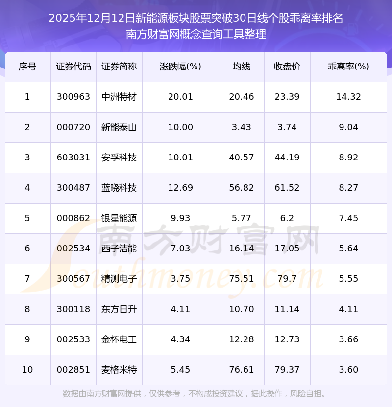 根据南方财富网概念查询工具数据统计,截止2025年12月12日收盘,新能源板块股票共有23只个股收盘价向上突破了30日线。其中乖离率较大的个股有中洲特材、新能泰山、安孚科技等,乖离率分别为14.32%、9.04%、8.92%。