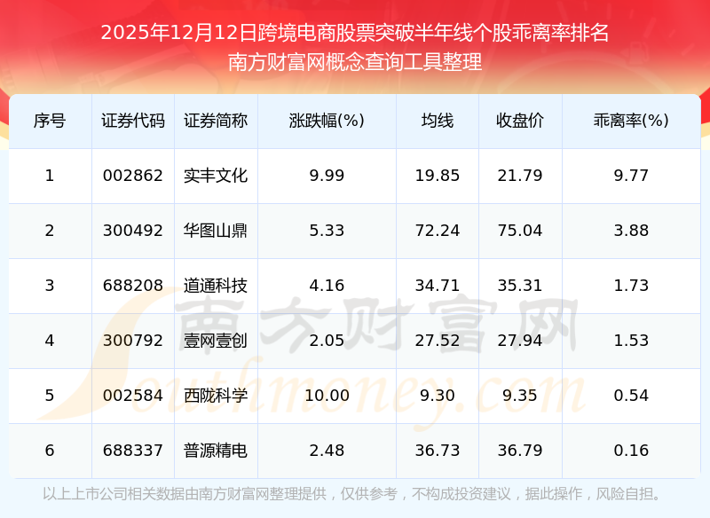 根据南方财富网概念查询工具数据统计,截止2025年12月12日收盘,跨境电商股票共有6只个股收盘价向上突破了半年线。其中乖离率较大的个股有实丰文化、华图山鼎、道通科技等,乖离率分别为9.77%、3.88%、1.73%。