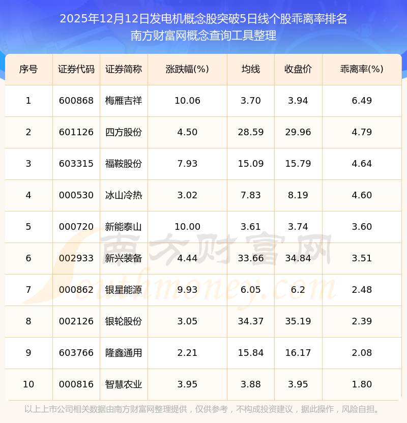 根据南方财富网概念查询工具数据统计,截止2025年12月12日收盘,发电机概念股共有20只个股收盘价向上突破了5日线。其中乖离率较大的个股有梅雁吉祥、四方股份、福鞍股份等,乖离率分别为6.49%、4.79%、4.64%。
