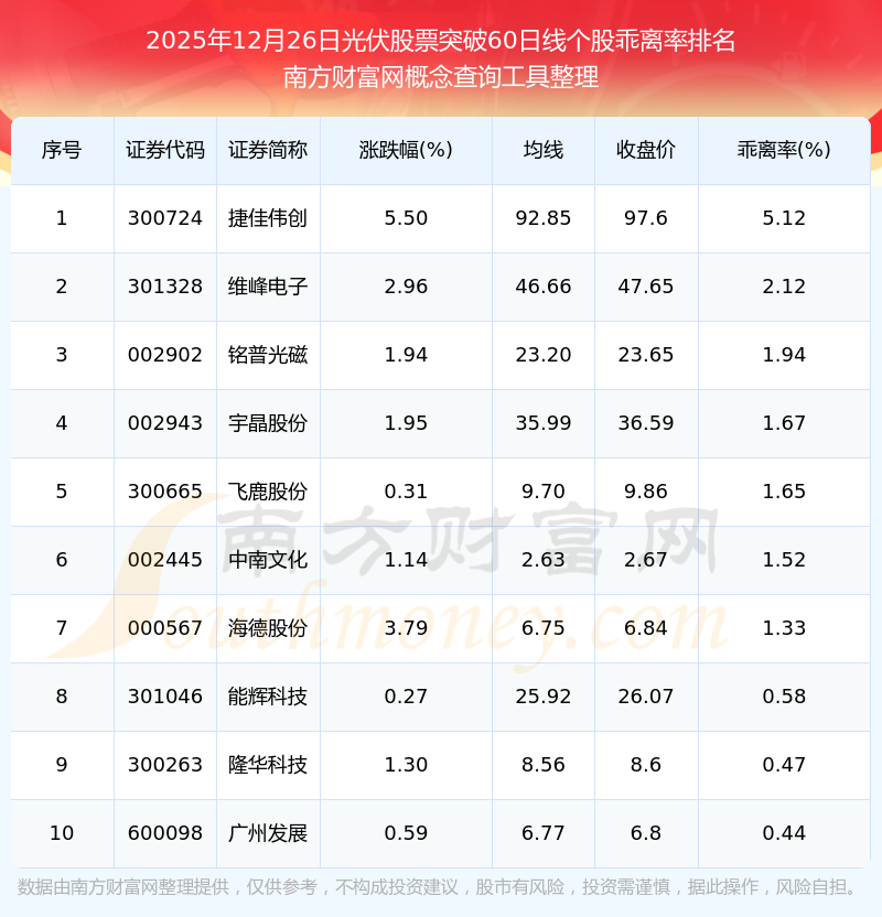 根据南方财富网概念查询工具数据统计,截止2025年12月26日收盘,光伏股票共有13只个股收盘价向上突破了60日线。其中乖离率较大的个股有捷佳伟创、维峰电子、铭普光磁等,乖离率分别为5.12%、2.12%、1.94%。