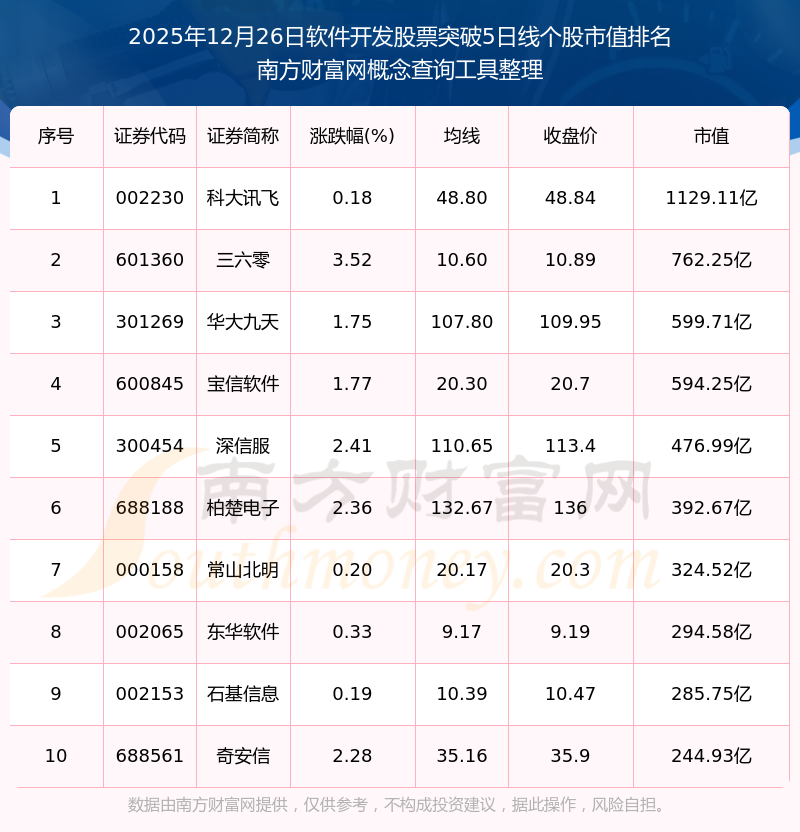 根据南方财富网概念查询工具数据统计,截止2025年12月26日收盘,软件开发股票共有42只个股收盘价向上突破了5日线。其中市值较大的个股有科大讯飞、三六零、华大九天等,市值分别为1129.11亿、762.25亿、599.71亿。