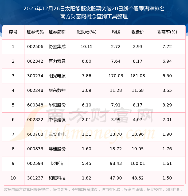 根据南方财富网概念查询工具数据统计,截止2025年12月26日收盘,太阳能概念股票共有21只个股收盘价向上突破了20日线。其中乖离率较大的个股有协鑫集成、巨力索具、阳光电源等,乖离率分别为7.72%、6.94%、6.50%。