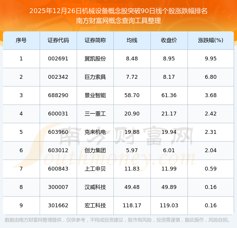 根据南方财富网概念查询工具数据统计,截止2025年12月26日收盘,机械设备概念股共有9只个股收盘价向上突破了90日线。其中涨幅较大的个股有冀凯股份、巨力索具、景业智能等,涨幅分别为9.95%、6.80%、3.68%。