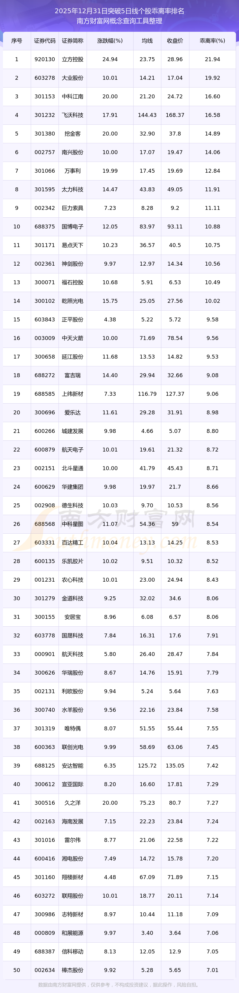 根据南方财富网概念查询工具数据统计,截止2025年12月31日收盘,共有726只个股收盘价向上突破了10日线,其中乖离率较大的个股有立方控股、中科江南、挖金客、久之洋、富吉瑞等,乖离率分别为25.10%、20.12%、17.68%、14.13%、12.89%。 2025年12月31日突破10