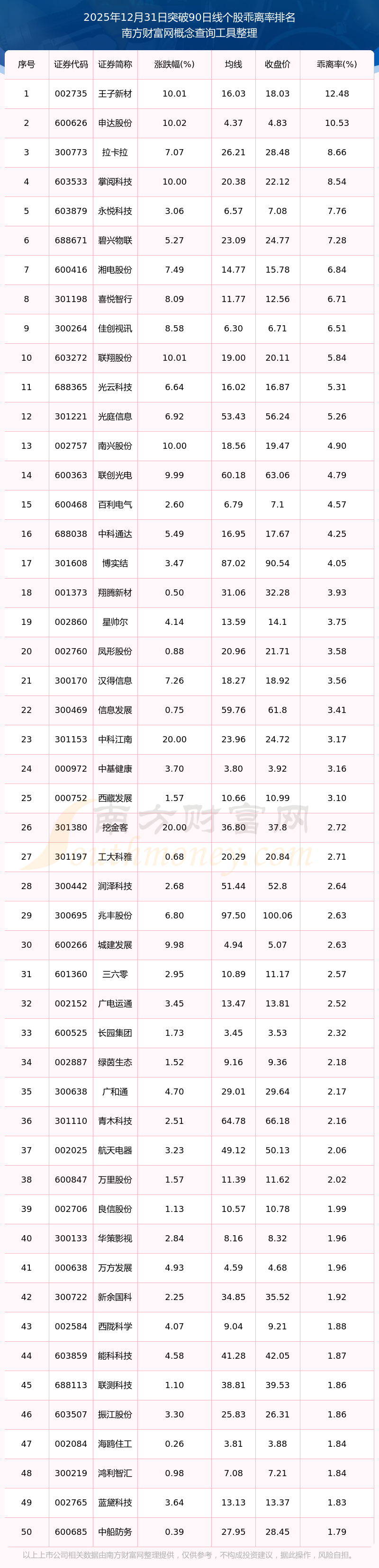 根据南方财富网概念查询工具数据统计,截止2025年12月31日收盘,共有141只个股收盘价向上突破了90日线,其中乖离率较大的个股有王子新材、申达股份、拉卡拉、掌阅科技、永悦科技等,乖离率分别为12.48%、10.53%、8.66%、8.54%、7.76%。