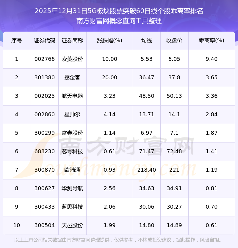 根据南方财富网概念查询工具数据统计,截止2025年12月31日收盘,5G板块股票共有20只个股收盘价向上突破了60日线。其中乖离率较大的个股有索菱股份、挖金客、航天电器等,乖离率分别为9.40%、3.65%、3.36%。