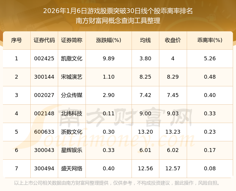 根据南方财富网概念查询工具数据统计,截止2026年1月6日收盘,游戏股票共有7只个股收盘价向上突破了30日线。其中乖离率较大的个股有凯撒文化、宋城演艺、分众传媒等,乖离率分别为5.26%、0.48%、0.40%。