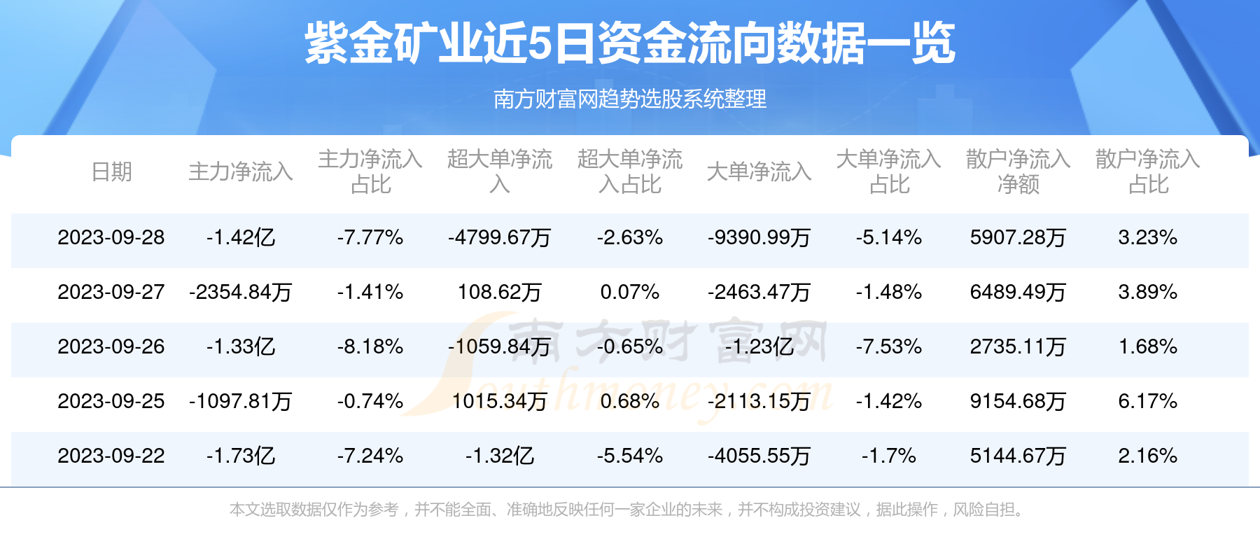 9月28日消息,紫金矿业9月28日主力资金净流出1.42亿元,超大单资金净流出4799.67万元,大单资金净流出9390.99万元,散户资金净流入5907.28万元。