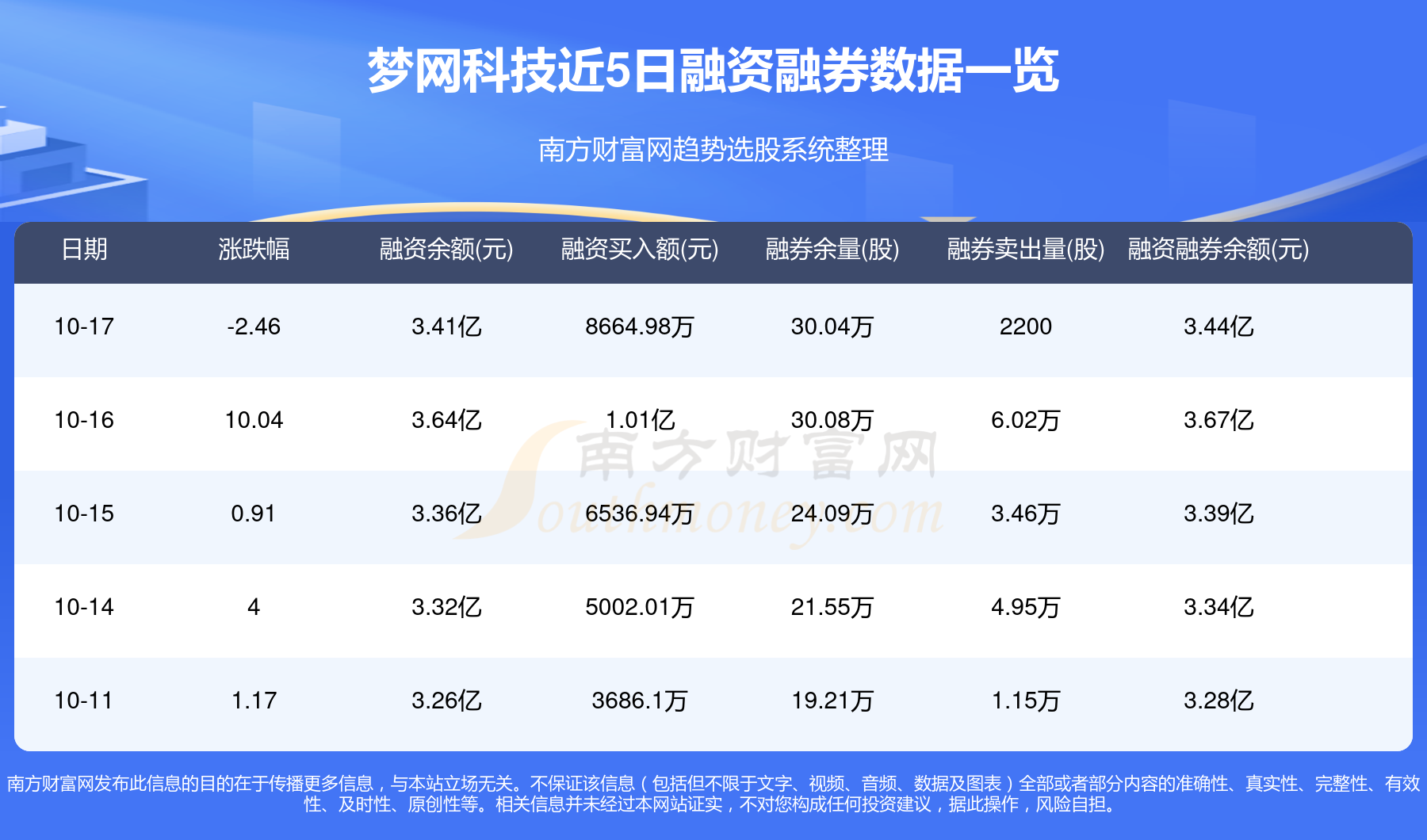 10月17日梦网科技融券信息显示,融资方面,当日融资买入8664.98万元,融资偿还1.1亿元,融资净买额-2295.34万元。融券方面,融券卖出2200股,融券偿还2600股,融券余量30.04万股,融券余额321.14万元。融资融券余额3.44亿元。近5日融资融券数据一览见下表: