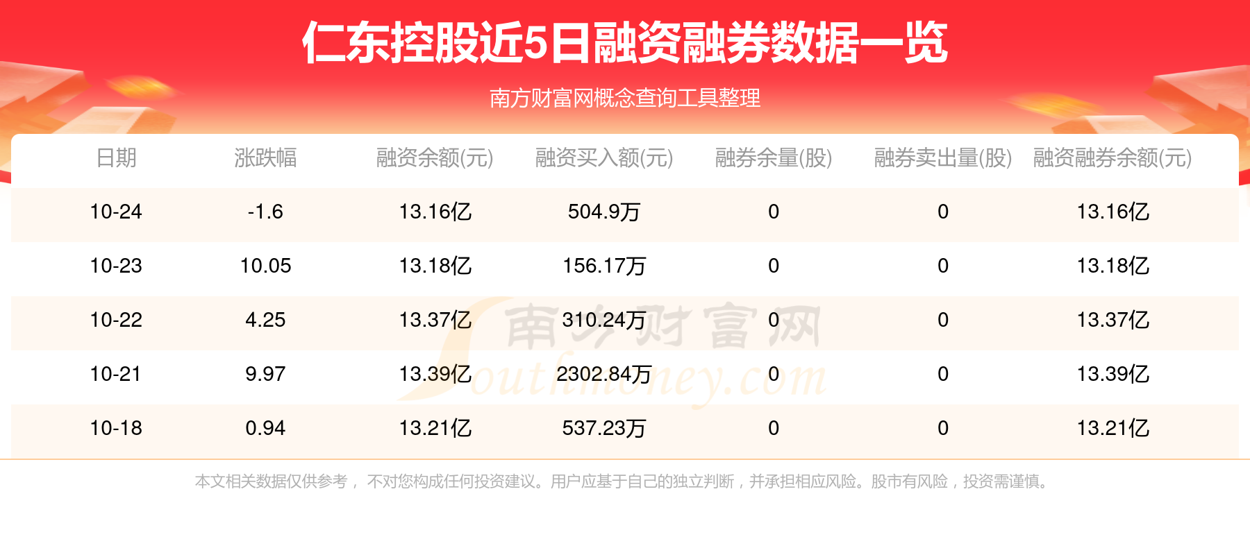 仁东控股10月24日融券信息显示,融资方面,当日融资买入504.9万元,融资偿还773.36万元,融资净买额-268.46万元。近5日融资融券数据一览见下表: