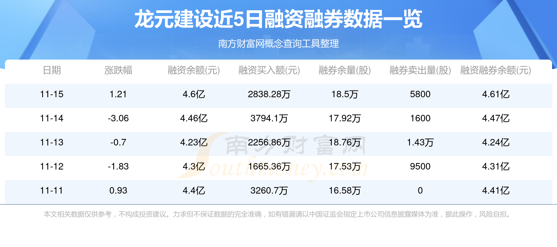 11月15日龙元建设融券信息显示,融资方面,当日融资买入2838.28万元,融资偿还1476.66万元,融资净买额1361.62万元。近5日融资融券数据一览见下表: