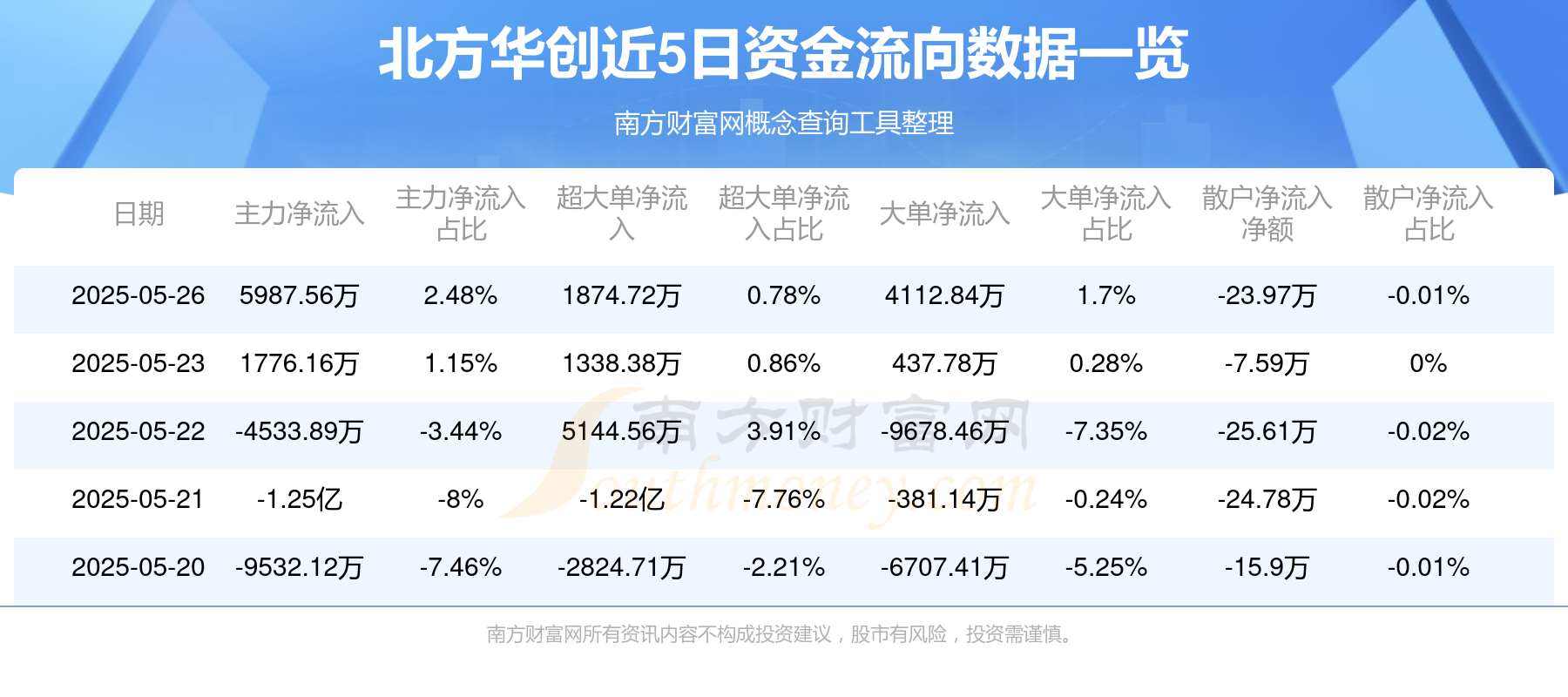 5月26日消息,北方华创5月26日主力净流入5987.56万元,超大单净流入1874.72万元,大单净流入4112.84万元,散户净流出23.97万元。