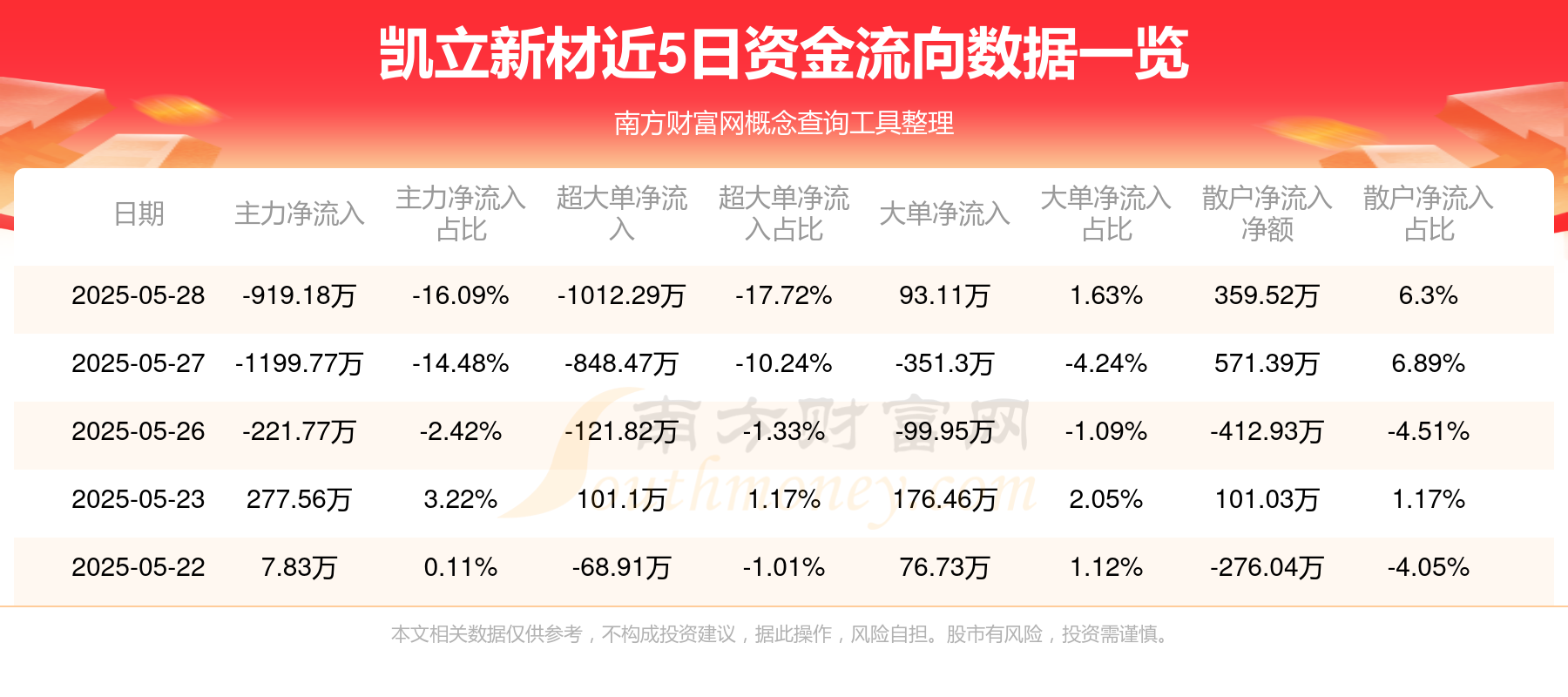 5月28日消息,凯立新材主力净流出919.18万元,超大单净流出1012.29万元,散户净流入359.52万元。