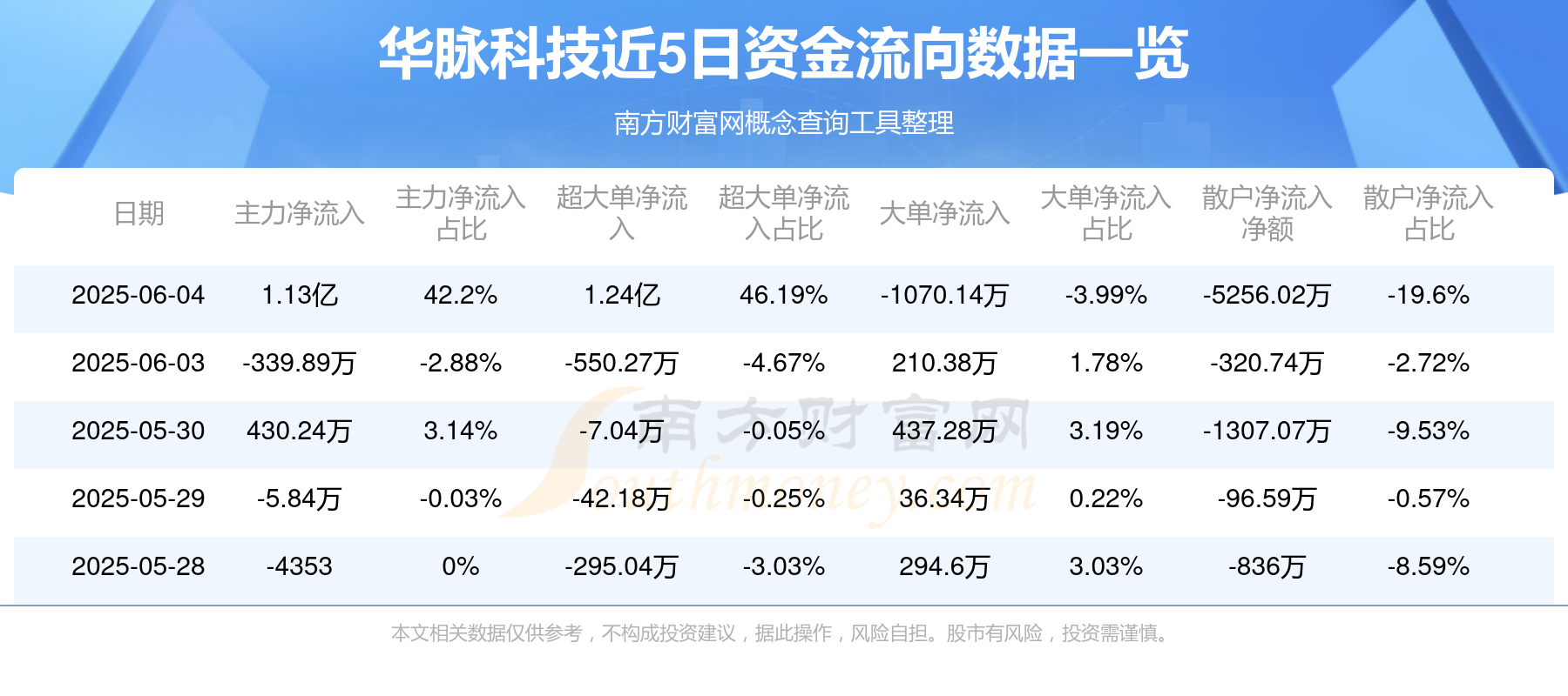 6月4日消息,华脉科技主力资金净流入1.13亿元,超大单资金净流入1.24亿元,散户资金净流出5256.02万元。