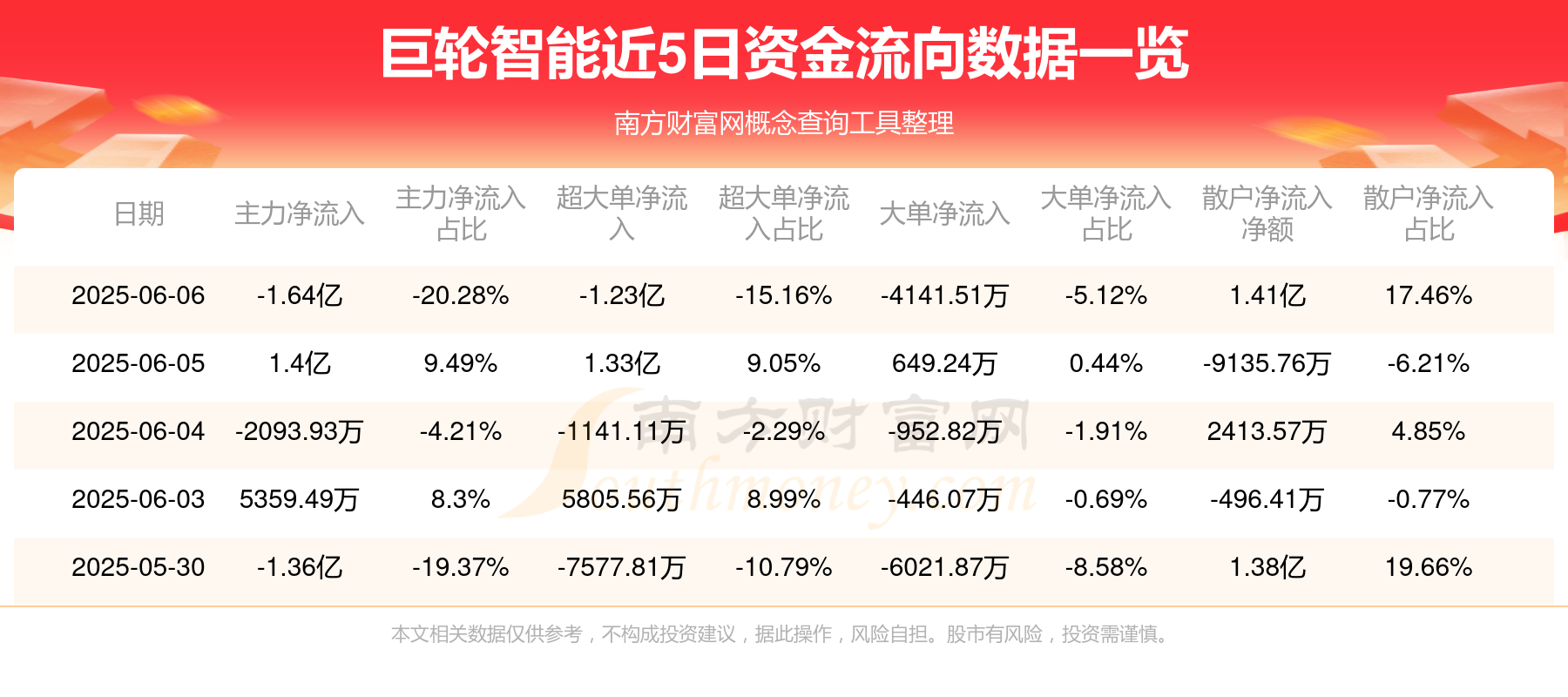 6月6日消息,巨轮智能主力净流出1.64亿元,超大单净流出1.23亿元,散户净流入1.41亿元。