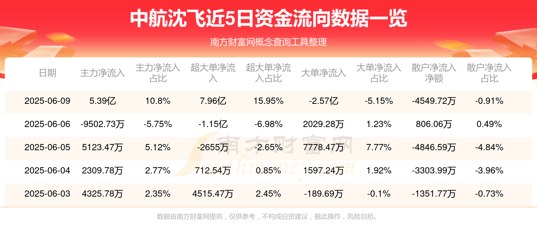 6月9日消息,中航沈飞资金净流入5.39亿元,超大单资金净流入7.96亿元,换手率3.33%,成交金额49.87亿元。