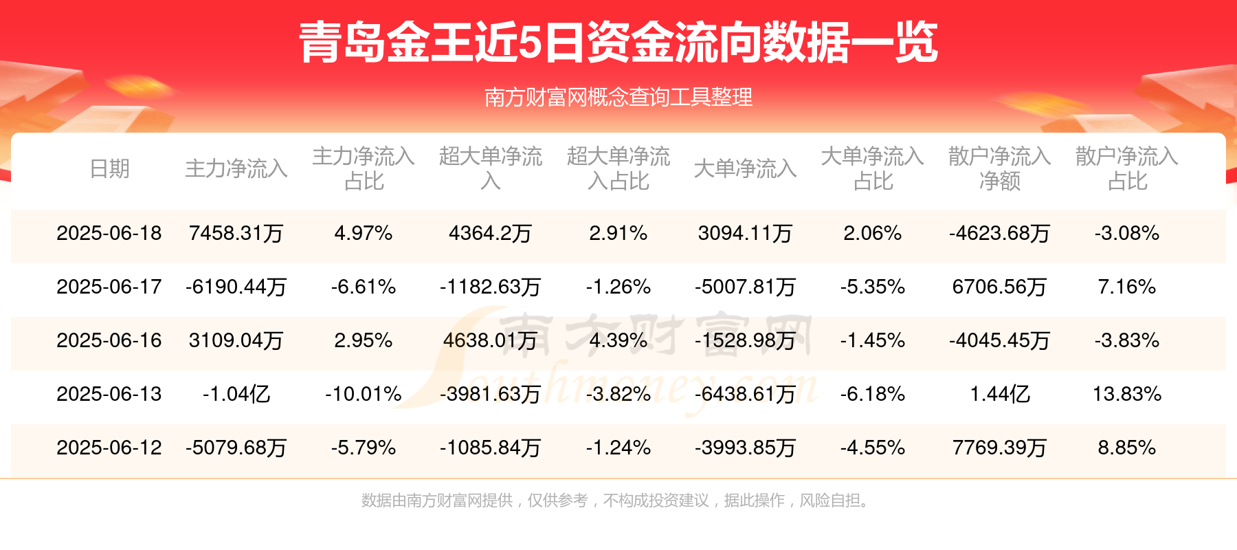6月18日消息,青岛金王主力资金净流入7458.31万元,超大单资金净流入4364.2万元,散户资金净流出4623.68万元。
