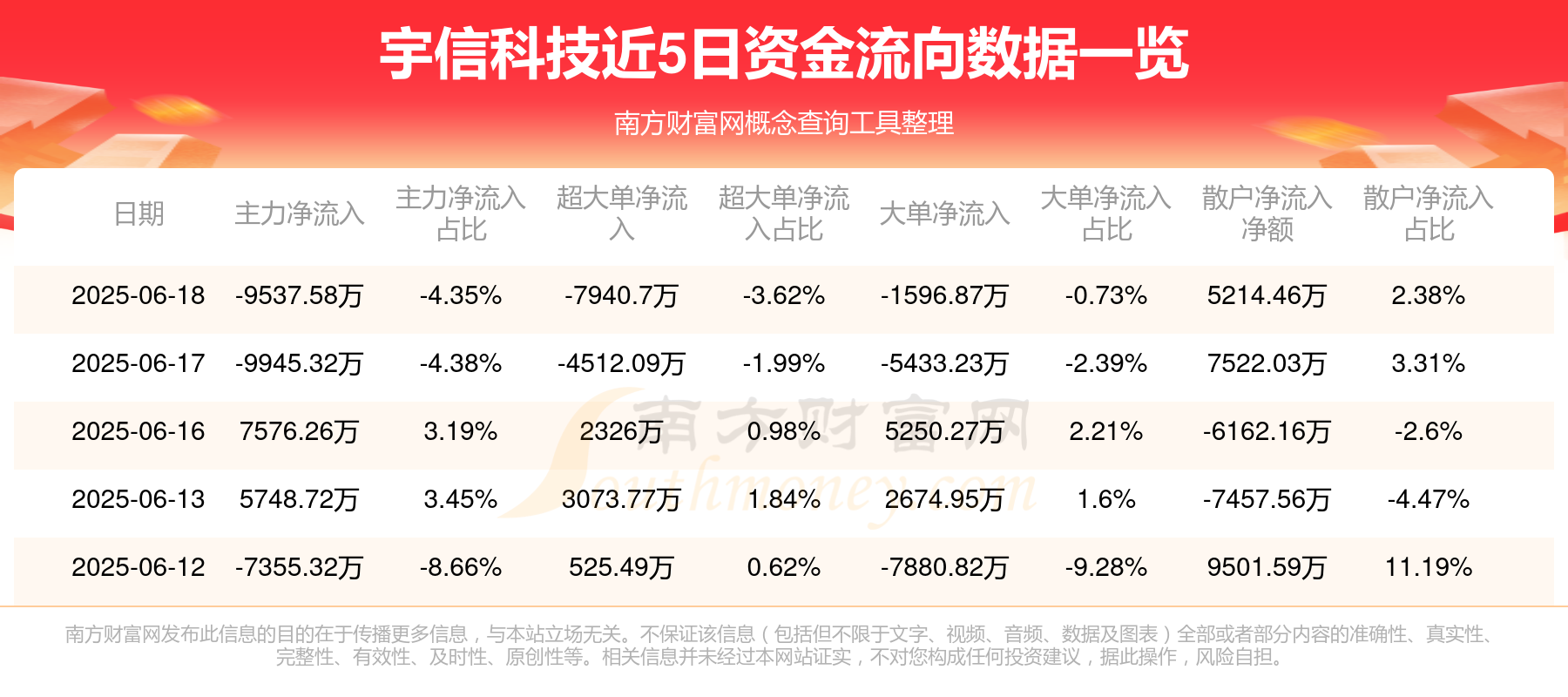 6月18日消息,宇信科技6月18日主力资金净流出9537.58万元,超大单资金净流出7940.7万元,大单资金净流出1596.87万元,散户资金净流入5214.46万元。