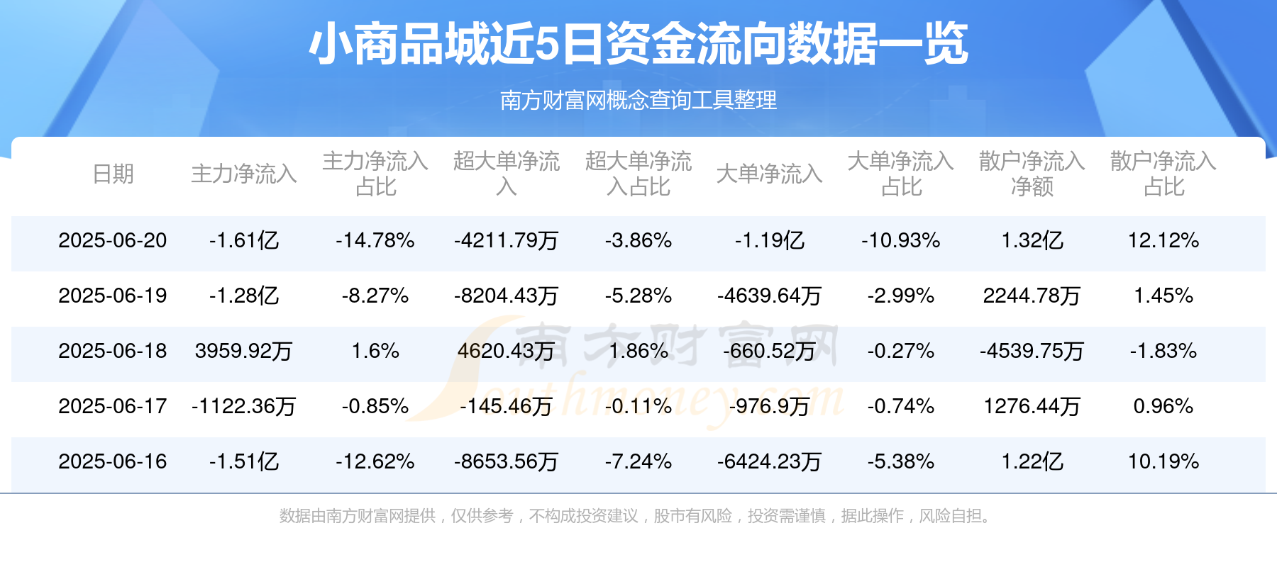 6月20日消息,小商品城主力净流出1.61亿元,超大单净流出4211.79万元,散户净流入1.32亿元。