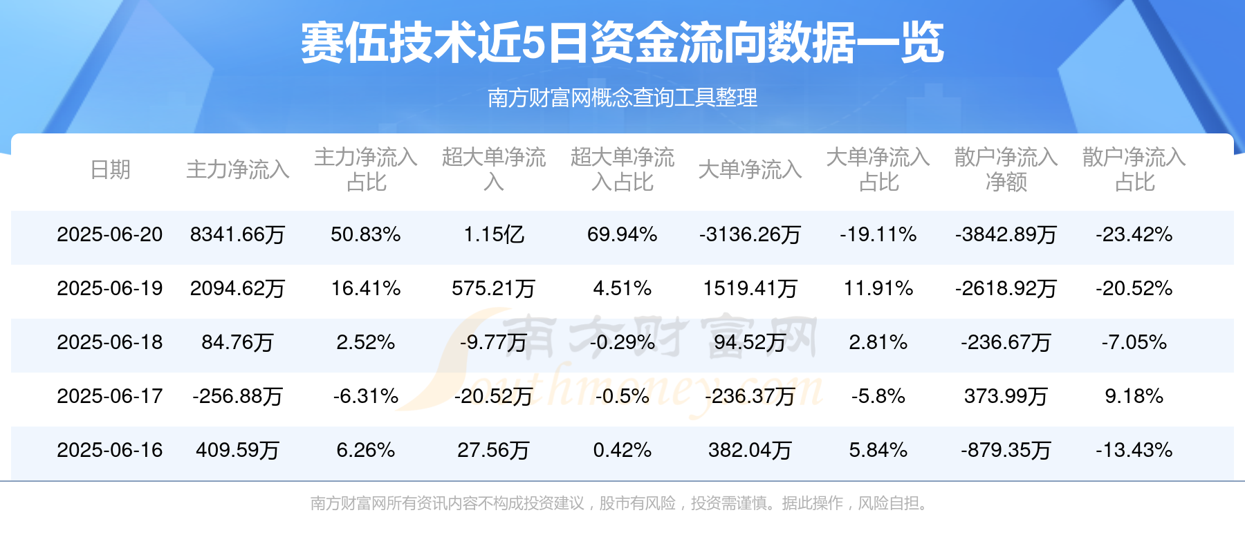6月20日主力资金净流入8341.66万元,超大单资金净流入1.15亿元,换手率3.41%,成交金额1.58亿元。