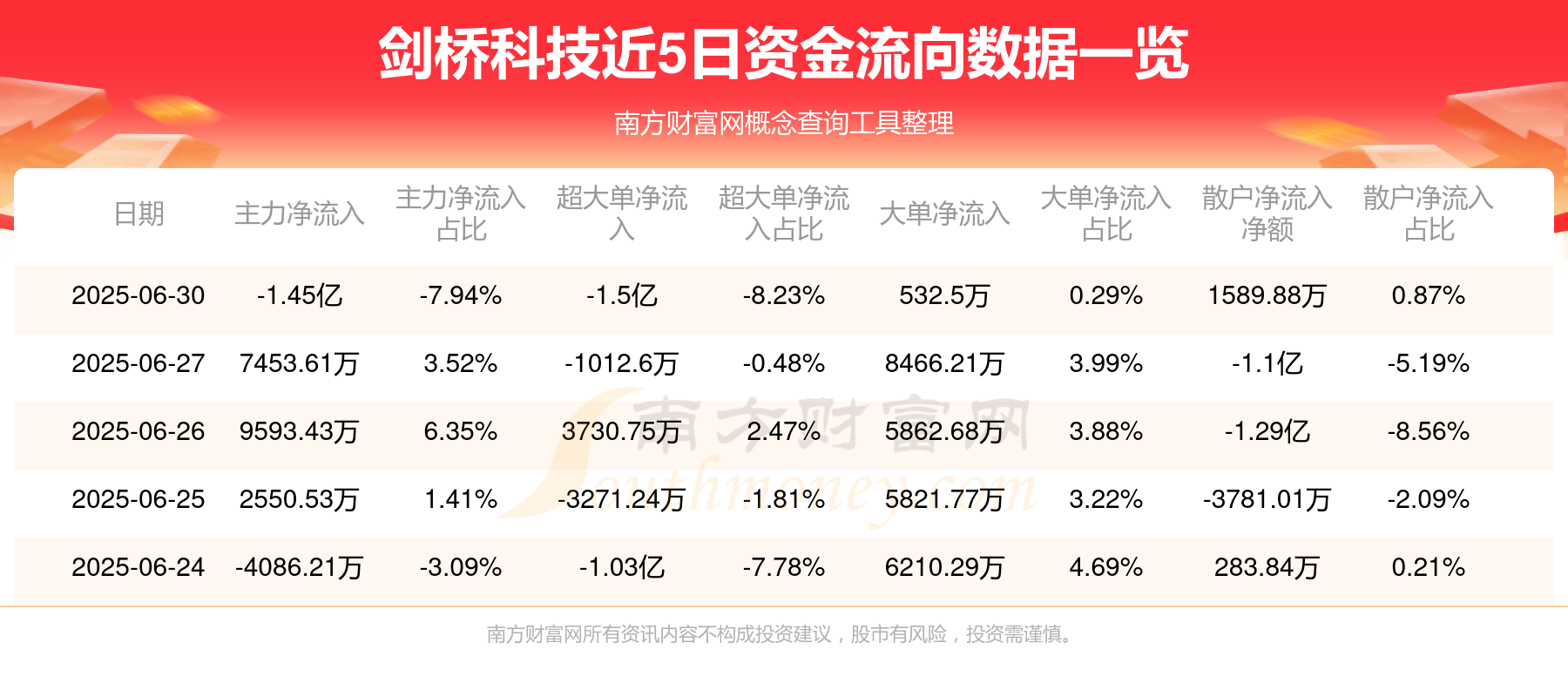 资金流向数据方面,6月30日主力资金净流流出1.45亿元,超大单资金净流出1.5亿元,大单资金净流入532.5万元,散户资金净流入1589.88万元。