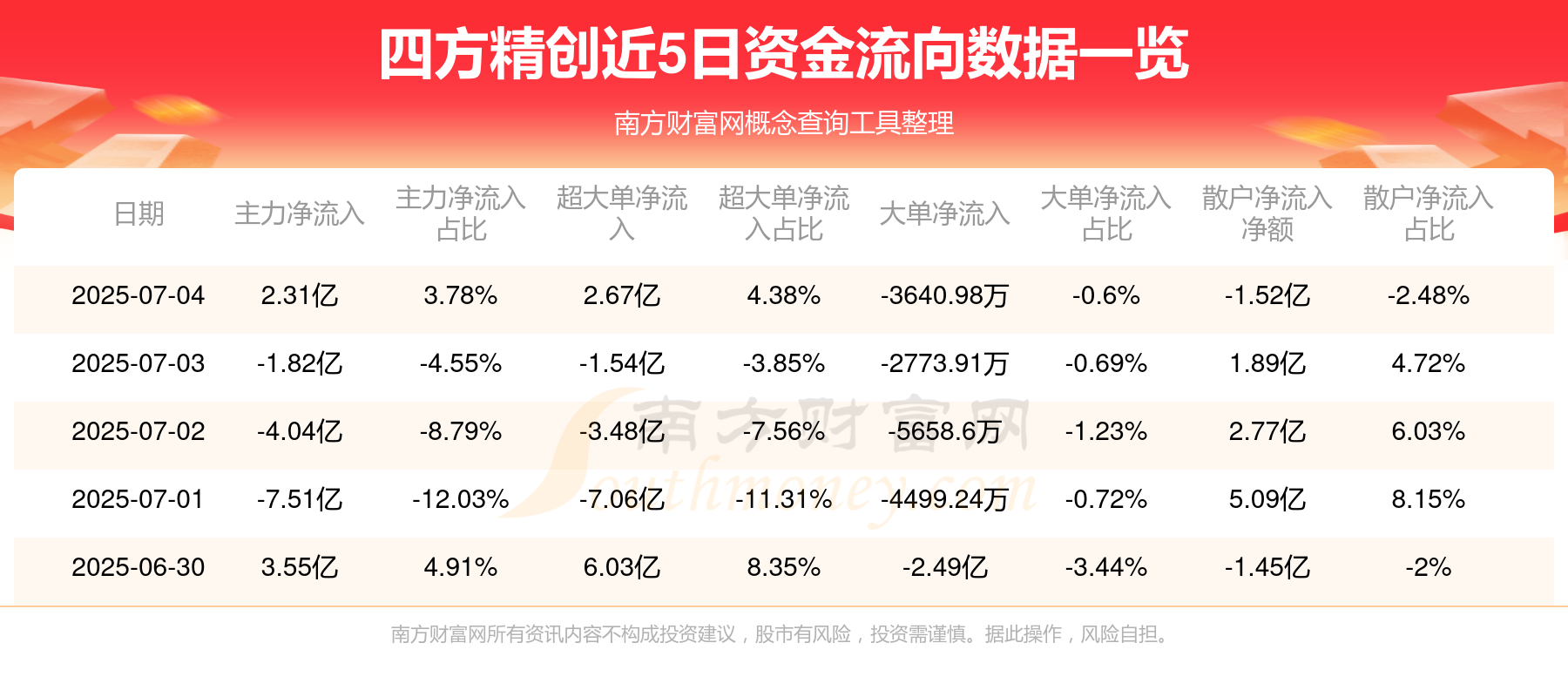7月4日消息,四方精创主力资金净流入2.31亿元,超大单资金净流入2.67亿元,散户资金净流出1.52亿元。