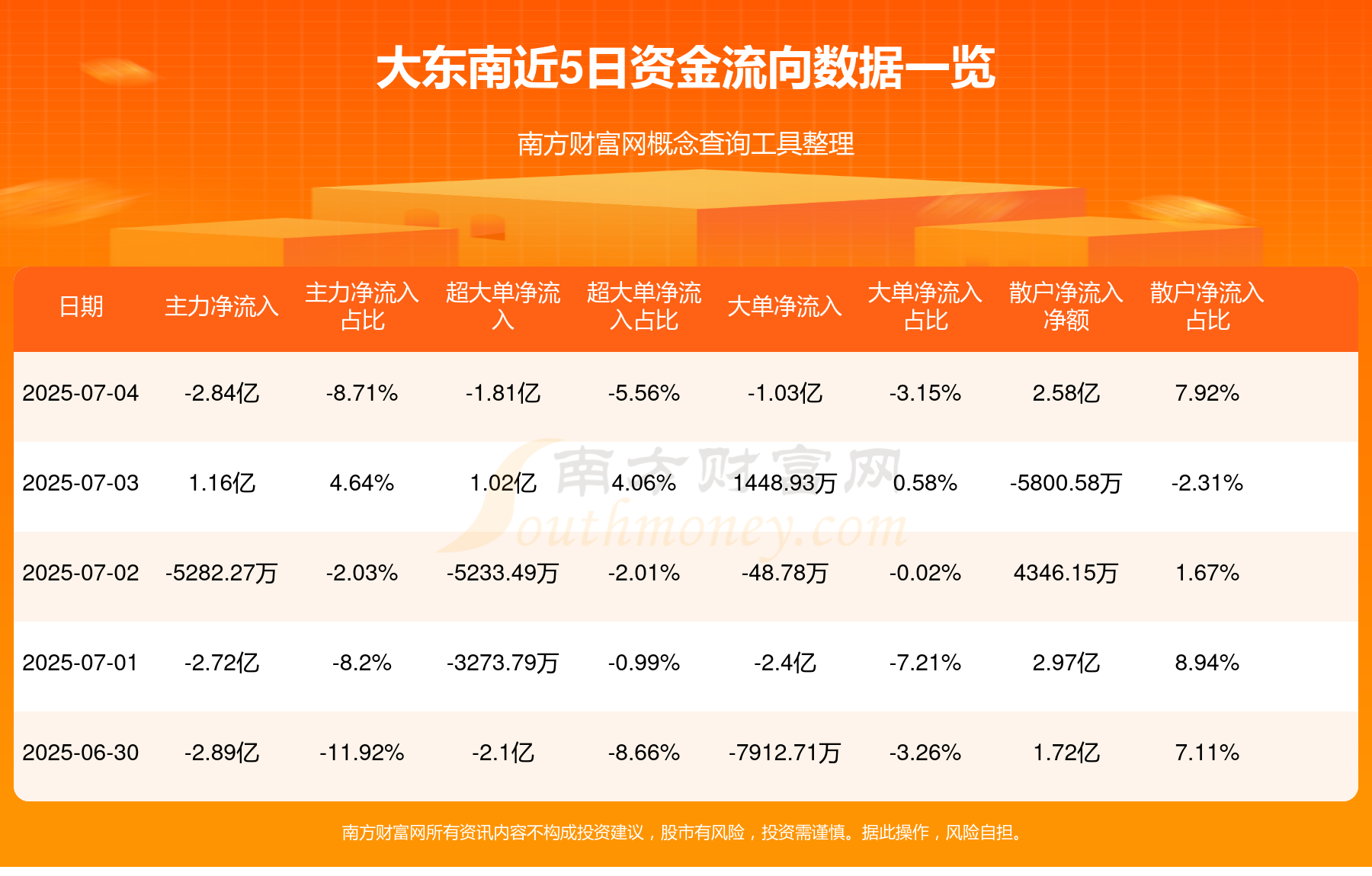7月4日消息,大东南主力净流出2.84亿元,超大单净流出1.81亿元,散户净流入2.58亿元。