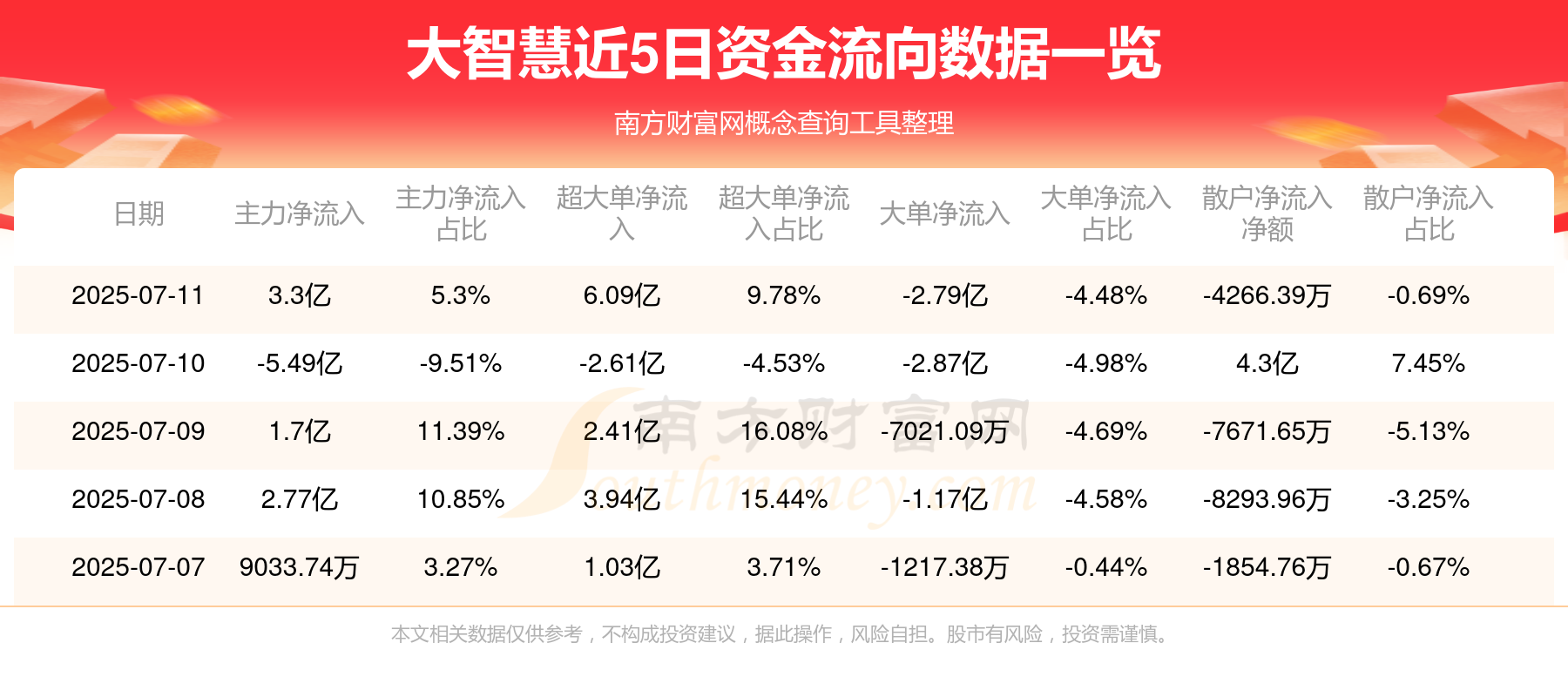 7月11日消息,大智慧资金净流入3.3亿元,超大单净流入6.09亿元,换手率20.14%,成交金额62.28亿元。