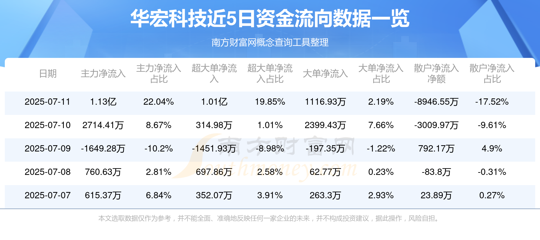 7月11日消息,华宏科技7月11日主力资金净流入1.13亿元,超大单资金净流入1.01亿元,大单资金净流入1116.93万元,散户资金净流出8946.55万元。