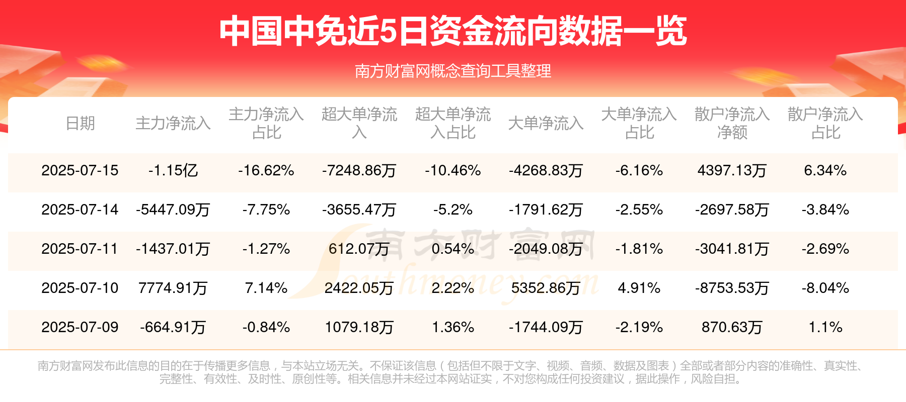 7月15日消息,中国中免主力净流出1.15亿元,超大单净流出7248.86万元,散户净流入4397.13万元。