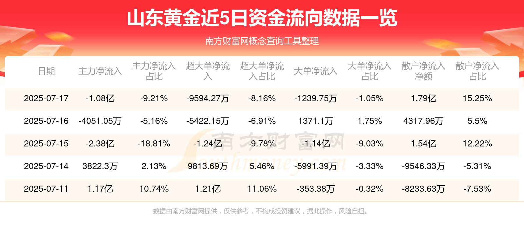 7月17日消息,山东黄金7月17日主力资金净流出1.08亿元,超大单资金净流出9594.27万元,大单资金净流出1239.75万元,散户资金净流入1.79亿元。