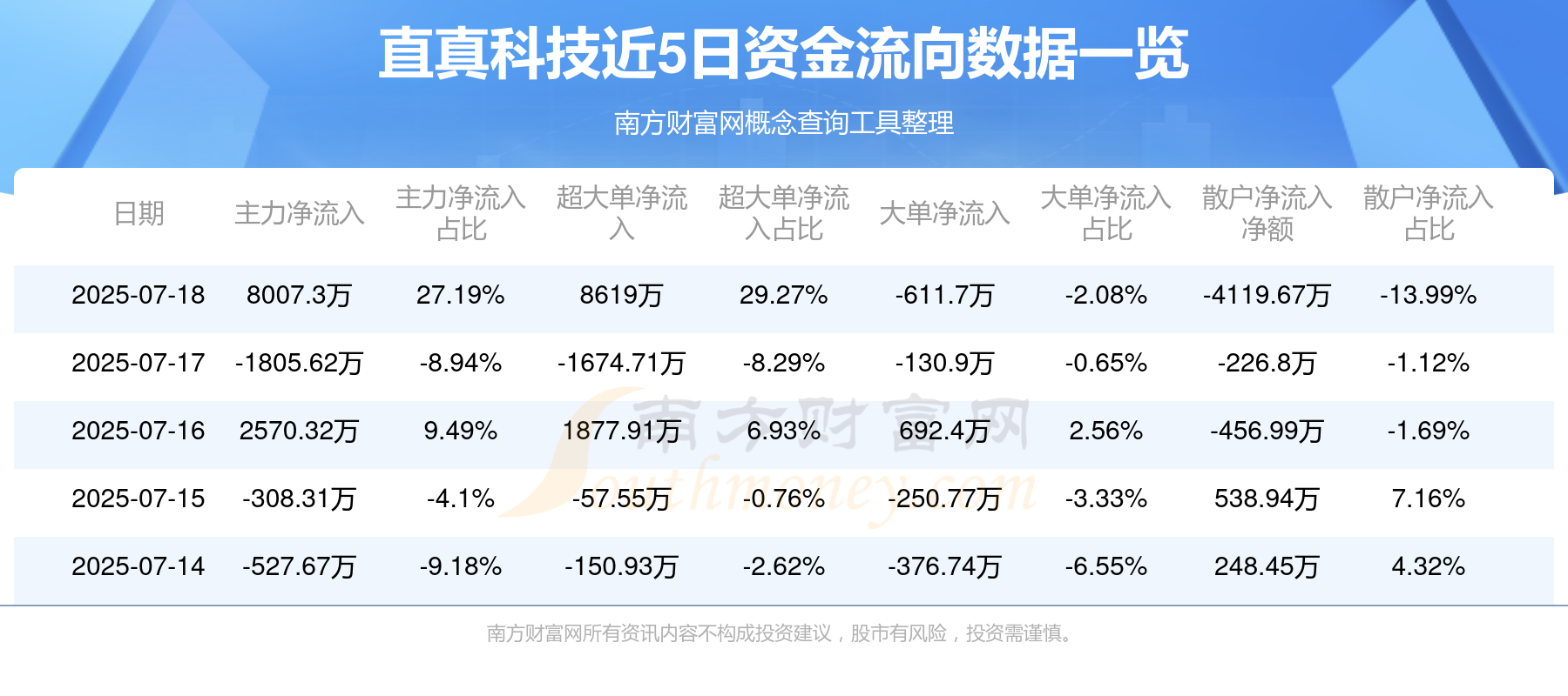 7月18日消息,直真科技主力净流入8007.3万元,超大单净流入8619万元,散户净流出4119.67万元。
