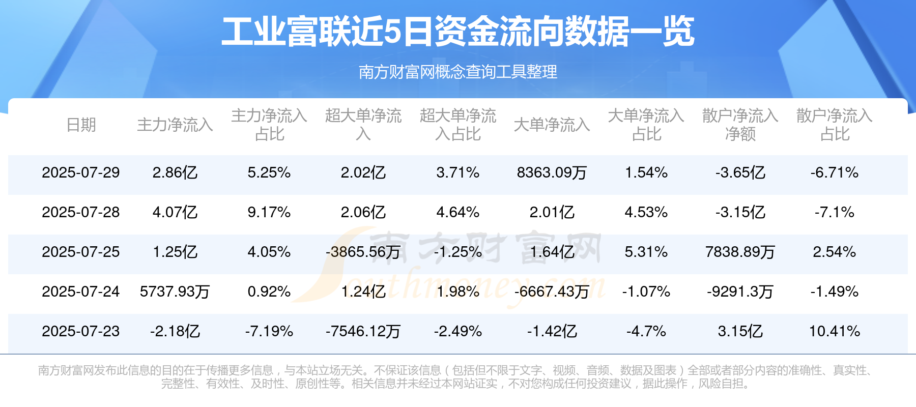 7月29日消息,工业富联资金净流入2.86亿元,超大单资金净流入2.02亿元,换手率0.9%,成交金额54.44亿元。