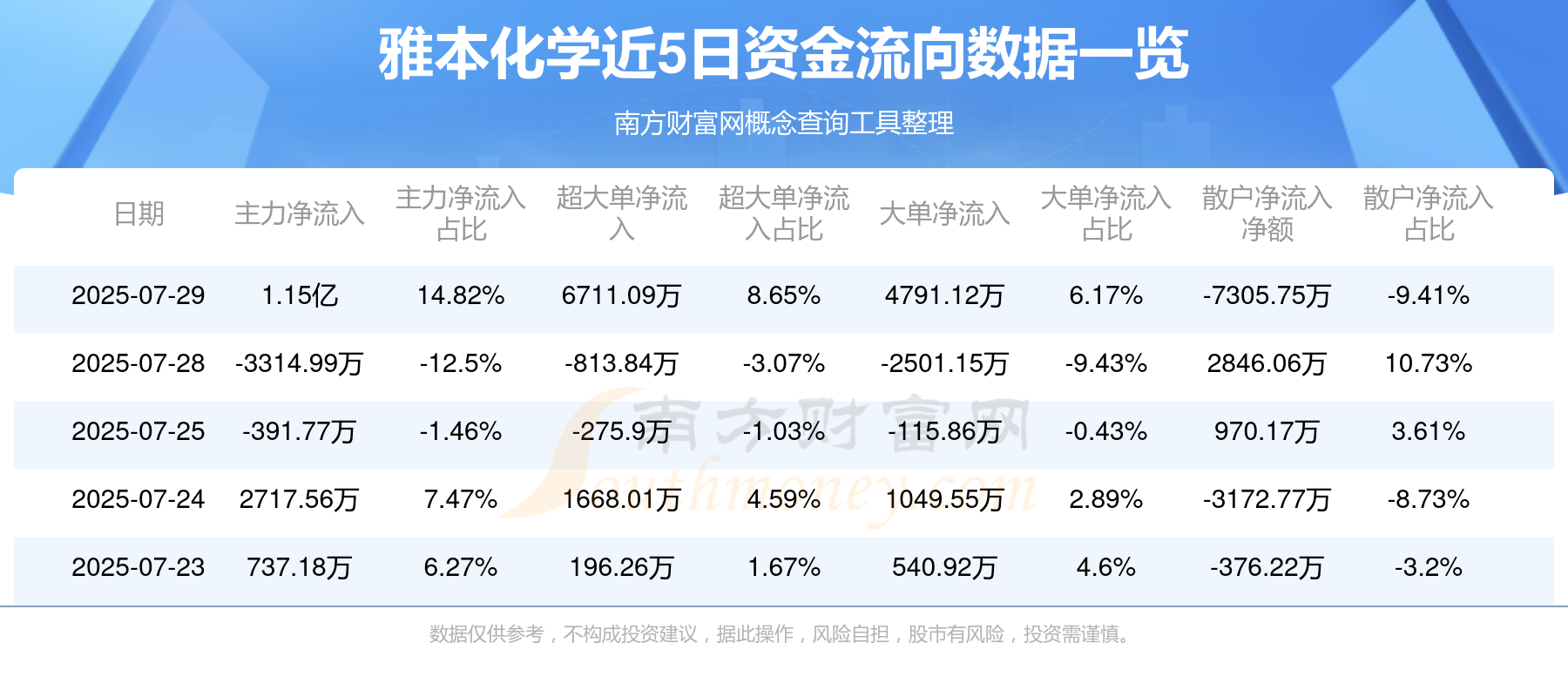 7月29日消息,雅本化学7月29日主力净流入1.15亿元,超大单净流入6711.09万元,大单净流入4791.12万元,散户净流出7305.75万元。