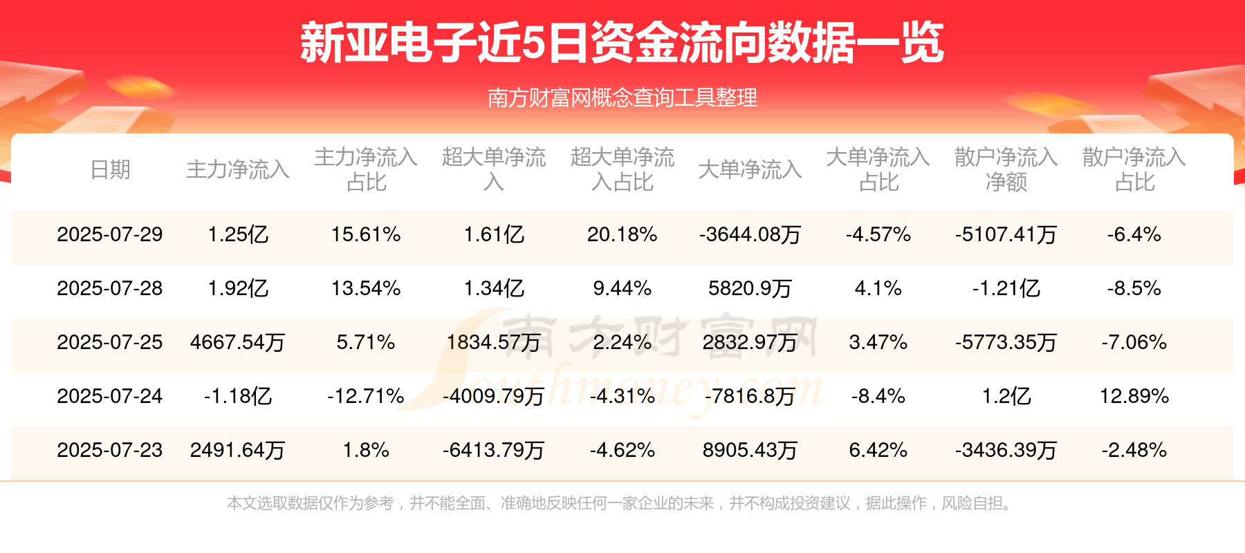 7月30日盘中消息,新亚电子最新报29.320元,成交量2772.93万手,总市值为95.08亿元。
