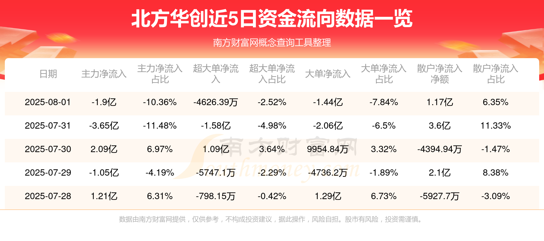 8月1日消息,北方华创主力资金净流出1.9亿元,超大单资金净流出4626.39万元,散户资金净流入1.17亿元。