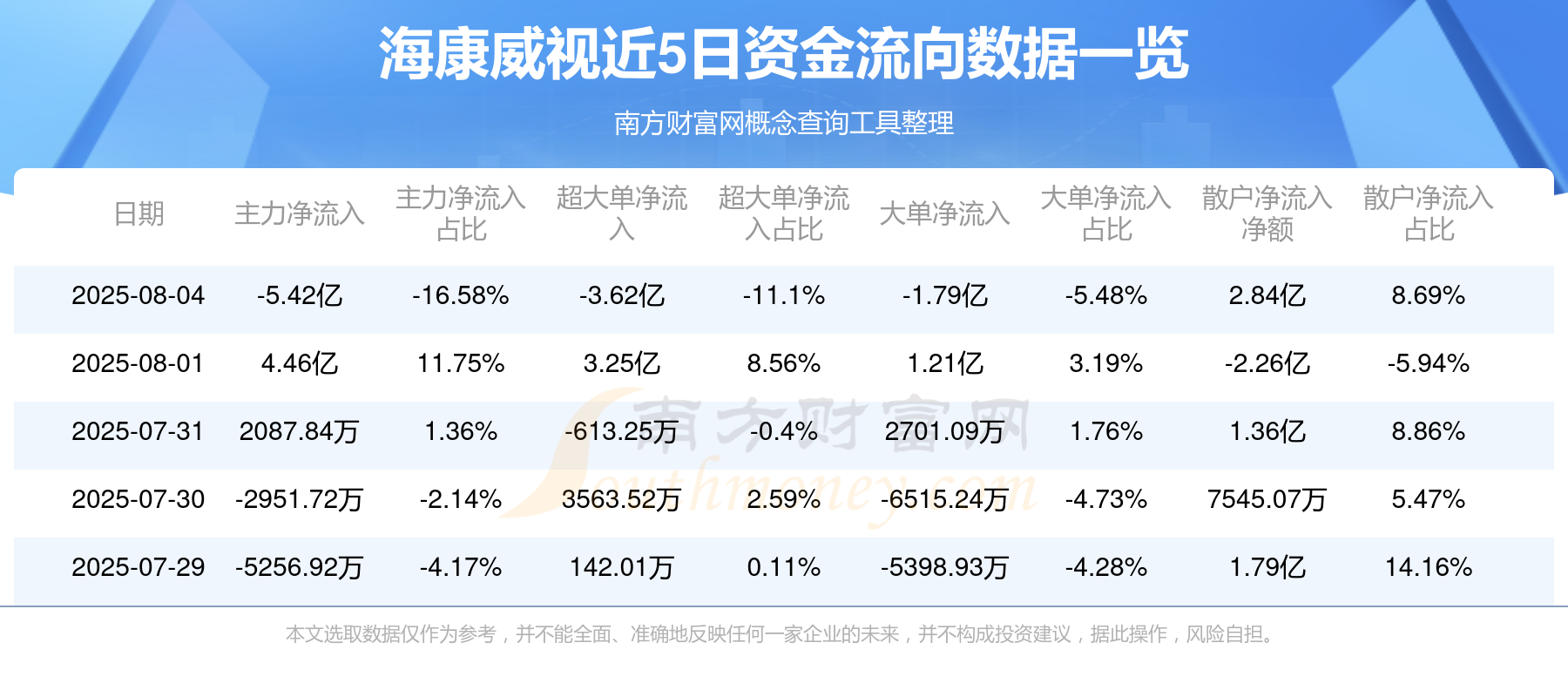 8月4日消息,海康威视资金净流出5.42亿元,超大单资金净流出3.62亿元,换手率0.41%,成交金额10.82亿元。