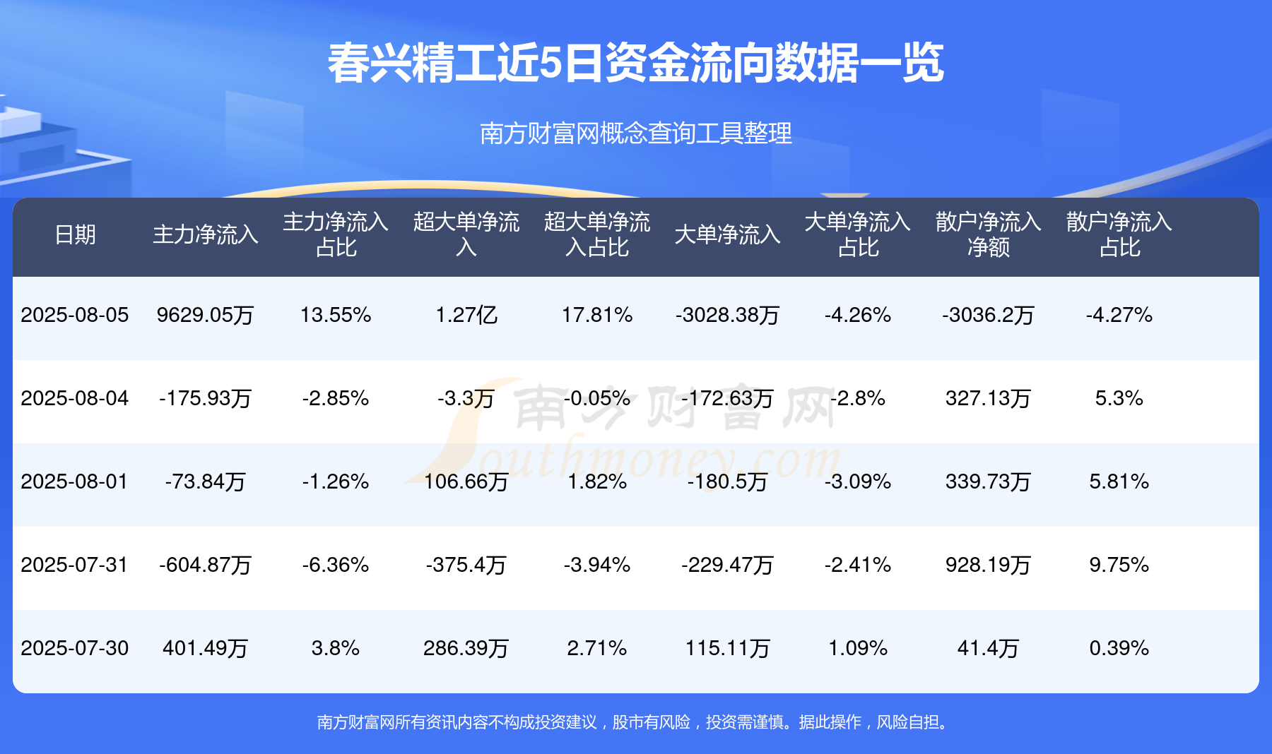 8月5日消息,春兴精工8月5日主力资金净流入9629.05万元,超大单资金净流入1.27亿元,大单资金净流出3028.38万元,散户资金净流出3036.2万元。