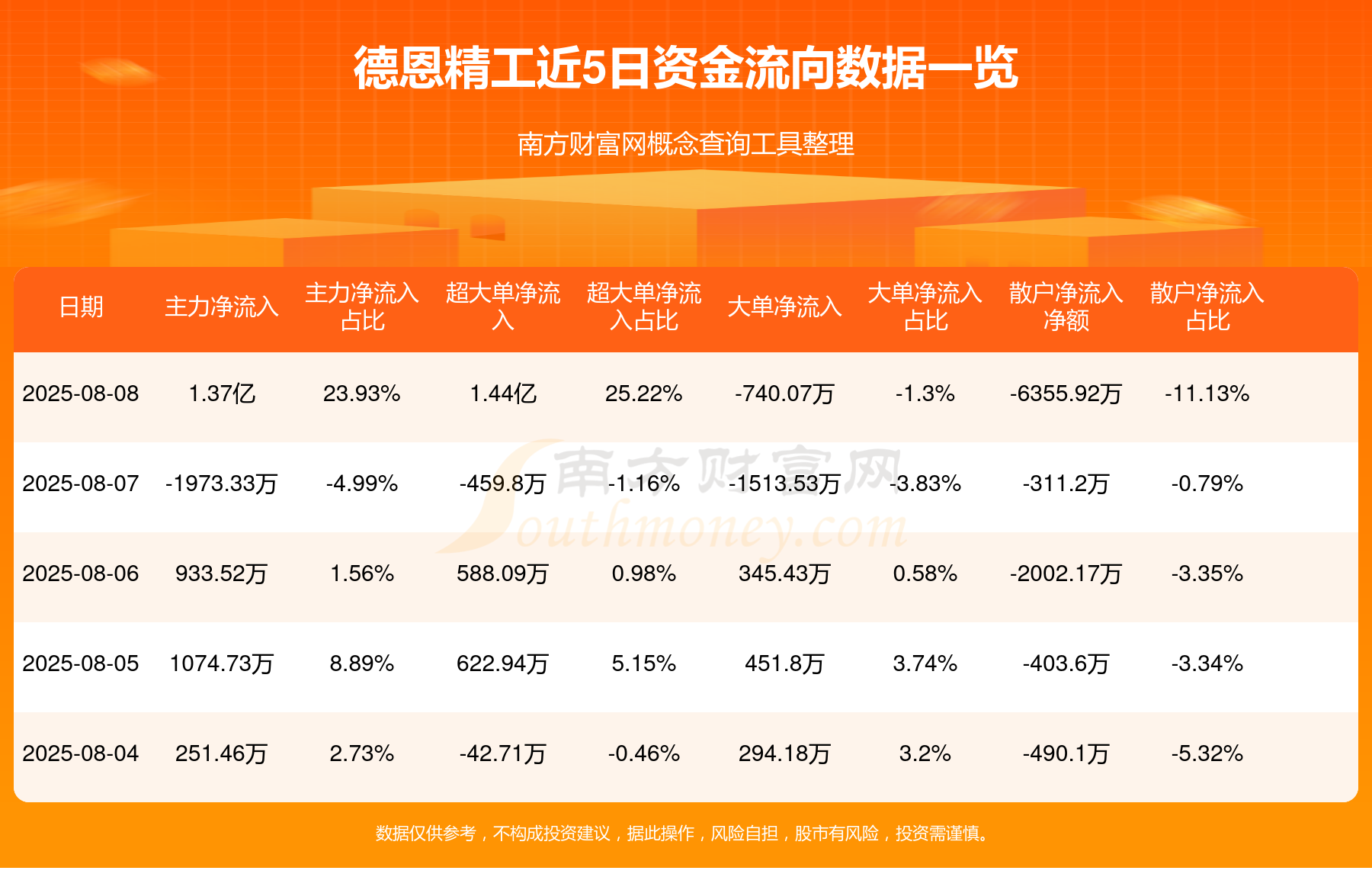 8月8日消息,德恩精工主力资金净流入1.37亿元,超大单资金净流入1.44亿元,散户资金净流出6355.92万元。