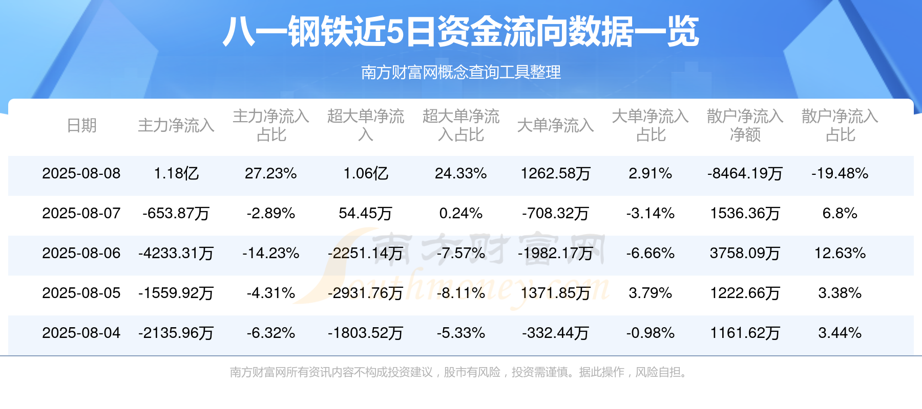 8月8日消息,八一钢铁8月8日主力净流入1.18亿元,超大单净流入1.06亿元,大单净流入1262.58万元,散户净流出8464.19万元。