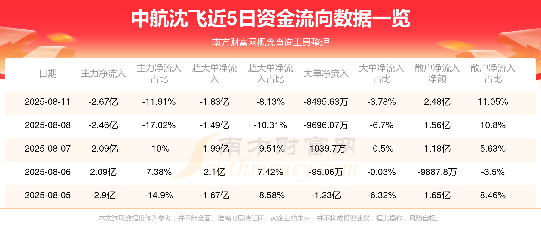 8月11日消息,中航沈飞8月11日主力净流出2.67亿元,超大单净流出1.83亿元,大单净流出8495.63万元,散户净流入2.48亿元。
