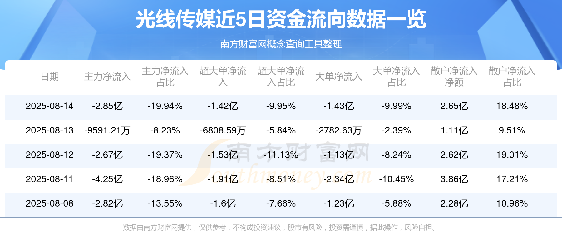 8月14日消息,光线传媒资金净流出2.85亿元,超大单资金净流出1.42亿元,换手率2.65%,成交金额14.32亿元。